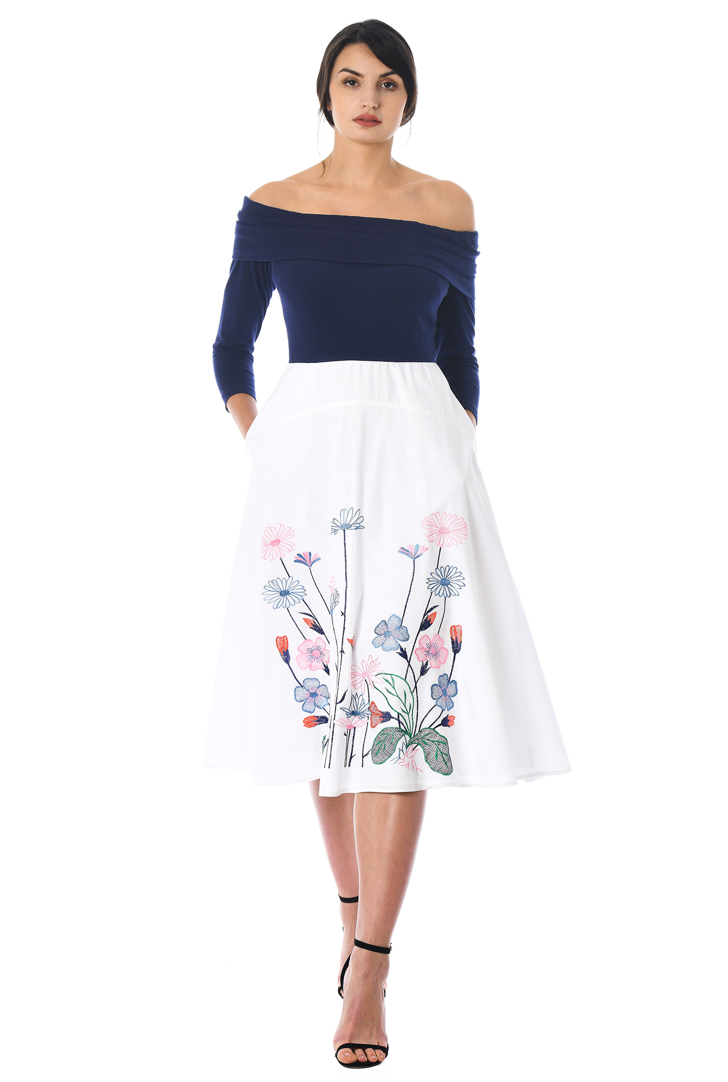 - http://www.eshakti.com/shop/Dresses/Off-the-shoulder-floral-embellished-mixed-media-dress-CL0056577
